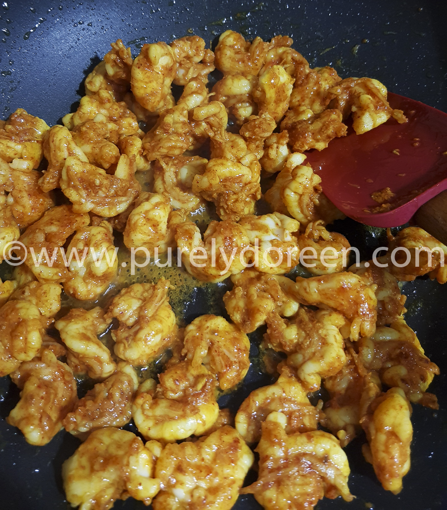 Heat oil in a pan, fry the prawns for about a minute till it just changes color. Remove the prawns and set it aside.