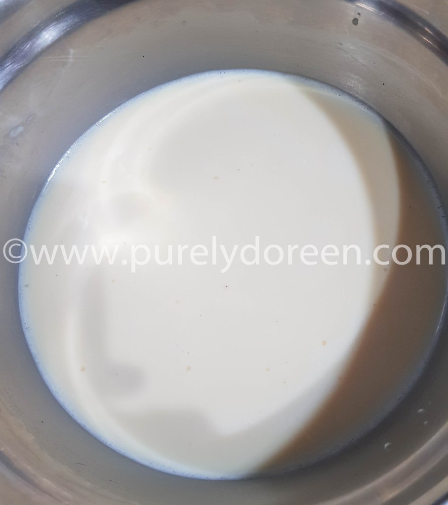 Add the vanilla extract, condensed milk and whole milk/evaporated milk and whisk till amalgamated.