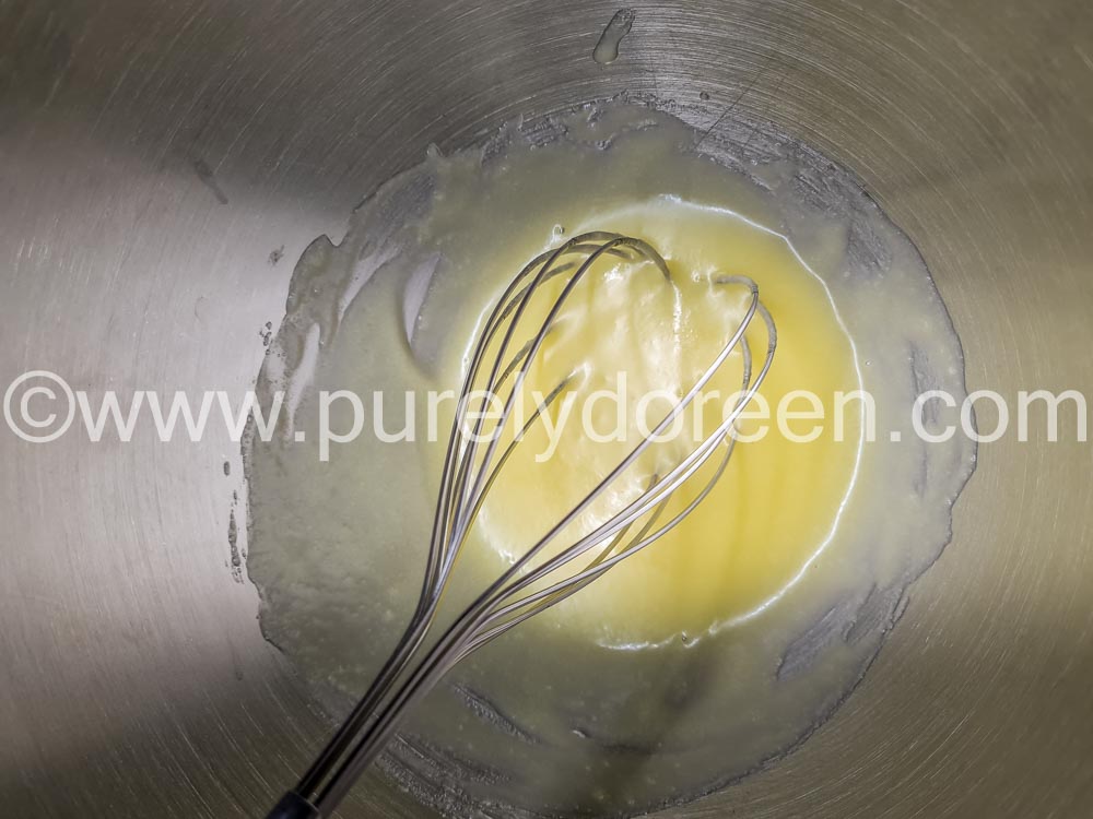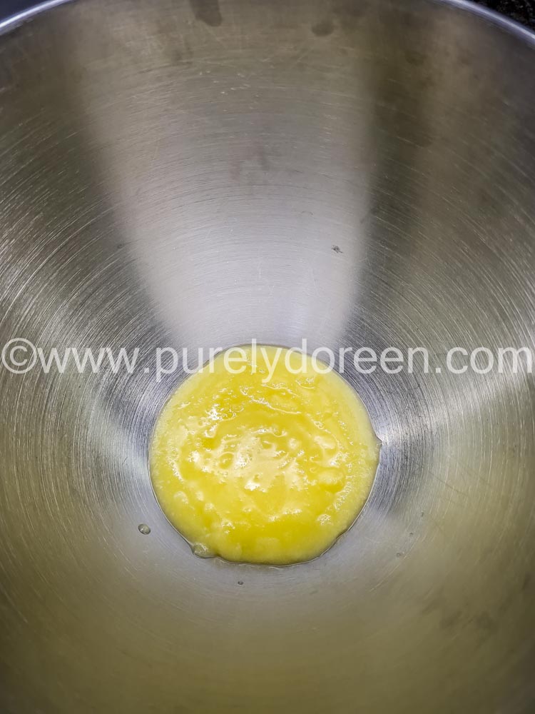 In a large bowl, put in the ghee and whisk it a bit to emulsify to look like creamy consistency,